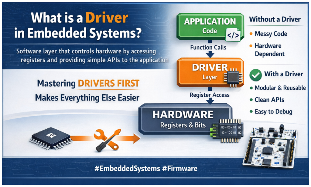 In embedded systems, a driver is the software layer that directly controls hardware by configuring and accessing memory-mapped registers. It understands how the peripheral works internally and exposes simple, safe APIs to the application layer.